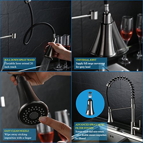 - FEATURE DETAILS: 1 handle integrate to control water temperature and flow volume easily, 360 degree rotatable coiled spout and long spray hose for wide range clearance of sink, flexible and extendable pull down wand with universal joint supply full range move smoothly, easy clean nozzle and advanced spray head filter system ensure impurities blocked outside