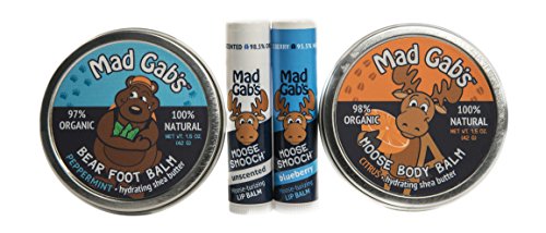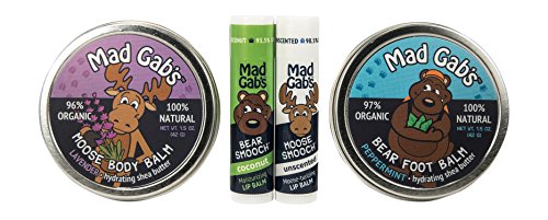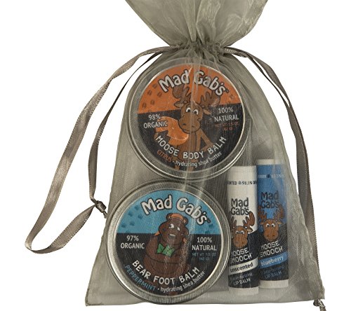 Gift Set includes: 1 Moose Citrus Balm, 1 Bear Peppermint Foot Balm, 2 Moose Smooch lips balm sticks, 1 unscented and 1 blueberry in organza bag