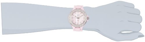 Pink-tone ceramic watch featuring unidirectional bezel with two rows of encrusted diamonds and pink mother-of-pearl dial with faceted stick indices and petite diamond at 12 o'clock
