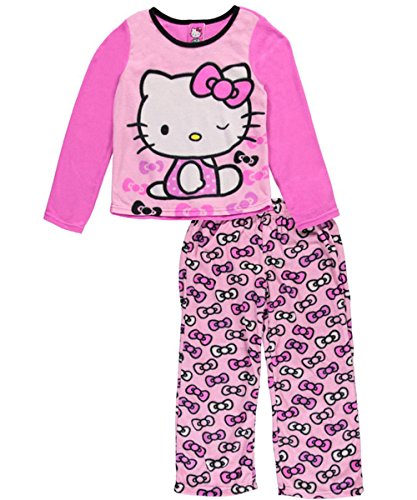 Your Hello Kitty fan will love the coordinated style of these 2-piece pajamas! Hello Kitty 2-piece pajamas Long-sleeved fleece top with graphic panel at front and rib-knit neckline (100% polyester) Fleece pants with elastic waistband (100% polyester)Feature