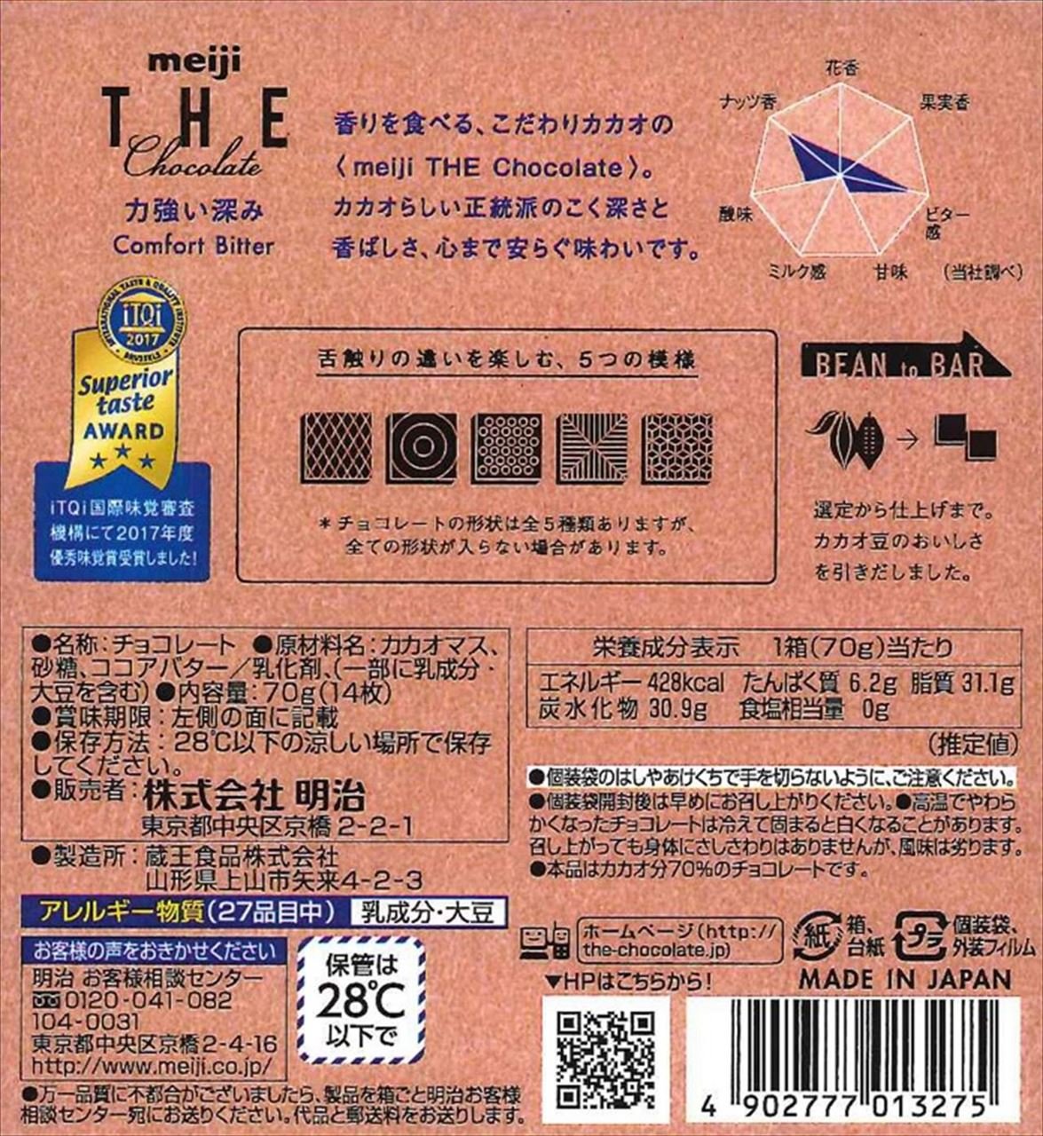 明治独自の基準で創りあげた「明治プレミアムカカオ豆」を使用した「プレミアムチョコレート生地」にて仕上げました。カカオ豆の特徴を最大限に引き出すことによって生まれる、カカオの特徴的な香味の違いを楽しめます。全体的に甘さを控えめにすることで上質なあじわいを強化。ベネズエラ産カカオ豆を中心に使用し、独自の高温深煎りローストによって深いコクと香ばしさを引き出しました。カカオ分70%、個包装された1口サイズのチョコレートです。明治は、赤ちゃんからお年寄りまで、いろいろなシーンでいつもあなたのそばにありたい。おいしさであなたとずっとつながっていたい。昨日より今日、今日よりも明日。あなたの明日をもっとおいしくするために。