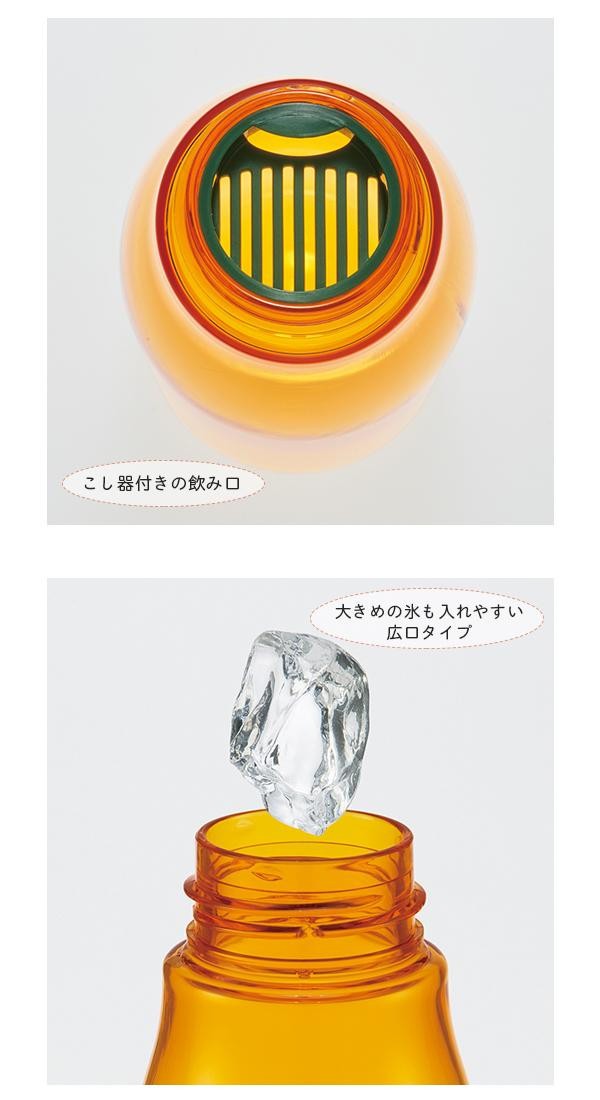 | フタを開けてすぐ飲める直飲みタイプ。ネジ式のフタなので水もれしにくく、持ちやすい形状です。液体だけが飲めるこし器付き飲み口なので、フレーバーウォーターなどにもピッタリ!! |