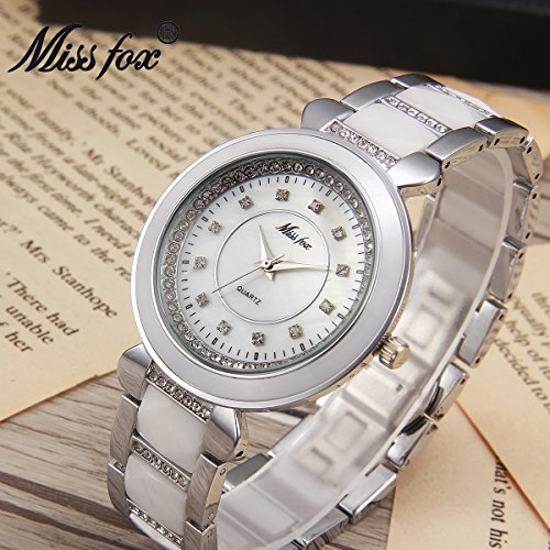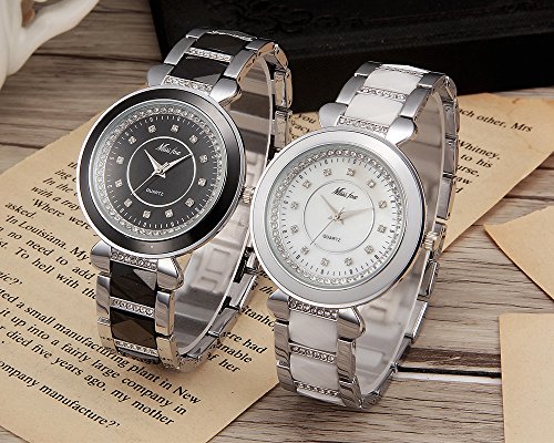 - Analog display with three hands powered by Japan quartz, screw down crown. Beautiful stainless steel band with white tone ceramic center links. Hidden-deployment clasp