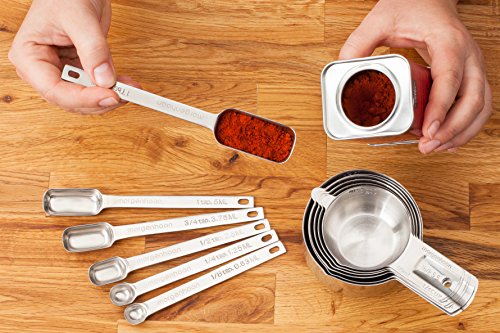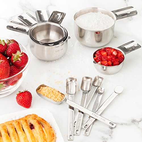 - ALL-IN-ONE SOLUTION: Includes a set of 6 measuring spoons cleverly designed to fit into small spice and herb containers for effortless scooping — handy when even "quick and easy" recipes have us running around the kitchen. Cups and spoons stack away neatly and the attractive satin polish finish adds a touch of elegance to any kitchen countertop