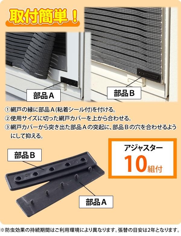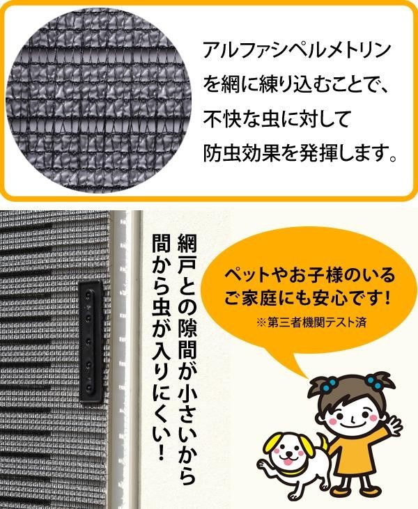 気になる虫の侵入や外からの視線を網戸の上から防止します。遮光率約86%、遮熱効果も約50%と省エネ対策に便利です。フリーでカットできるので、ご使用いただく場所に合わせてカットしてご使用ください。防虫効果のあるアルファシペルメトリンを網に練り込むことで、不快な虫に対して効果を発揮します。 |