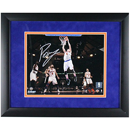 Kristaps Porzingis Signed and Framed Dunking vs. Spurs 8x10 Photo (Flat black frame w/ blue over orange matte)