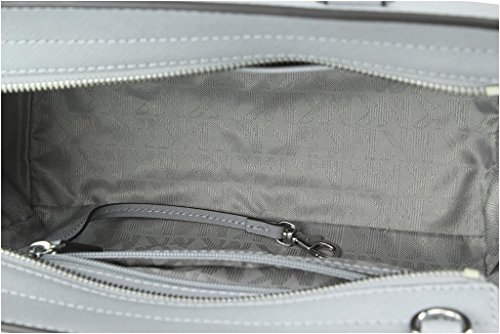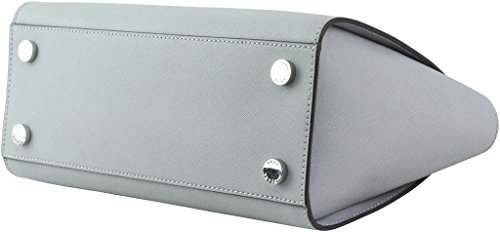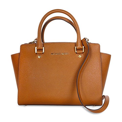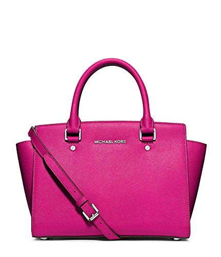 Saffiano leather encases this chic Michael Michael Kors satchel with rich, ultra-chic texture. Featuring a top-zip closure, dual rolled top handles, a buckle-adjustable crossbody strap, logo lettering at front and a winged silhouette. Zip pocket and two open pockets at interior 13" W x 8" H x 4" D Strap drop length: 19 1/2" Polyester liningFeature