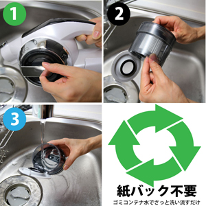 ●紙バックは不要、水洗いができるゴミコンテナいつも清潔!