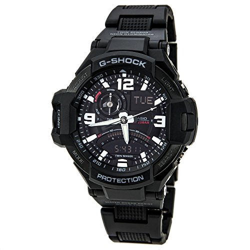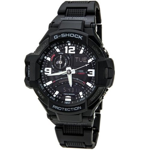 GA1000 is the first in the G-Aviation lineup to be equipped with Twin Sensor capabilities, creating a watch that is perfectly matched to the needs of the modern aviator, both in terms of function and appearance. Pressing the button at the 9 o'clock position in any mode immediately goes to the Digital Compass Mode with bearing memory. Other features include temperature measurement, large numerals, and thick hands for easy reading. A coating on the tip of the second hand and minute markers reacts with the black light illumination of the watch for easy reading in the dark. Black fine resin composite band ana-digi with black/white face.