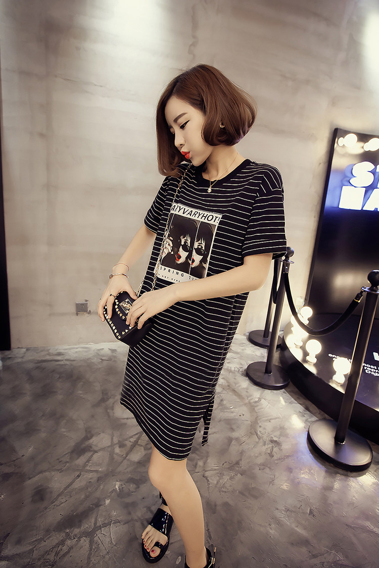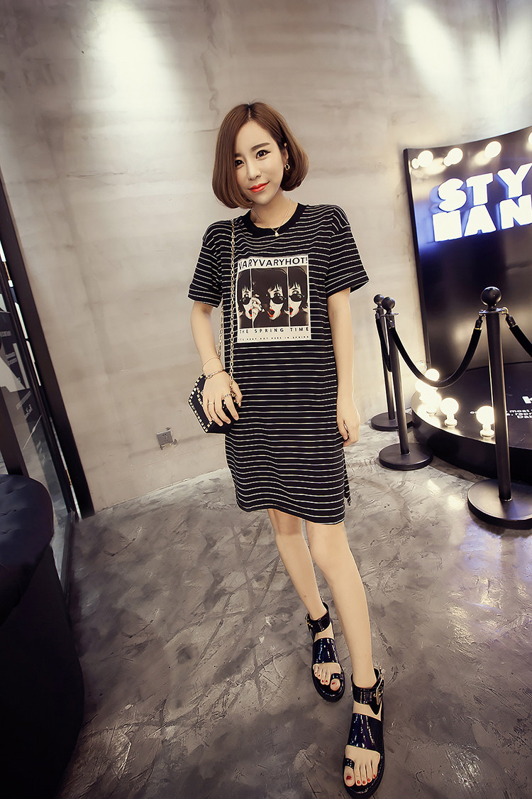 2016新款韩版学院风印花短袖连衣裙夏季宽松大码中长款T恤裙子潮