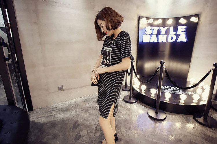 T恤女修身短袖夏季韩版字母印花宽松显瘦侧开叉中长款体恤裙学生