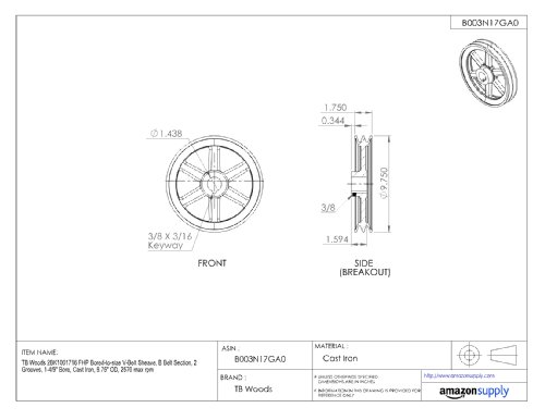 TB Woods 2AK2012 FHP Bored-to-size V-Belt Sheave, A Belt Section, 2 Grooves, 1/2" Bore, Cast Iron, 2.05" OD, 12200 max rpm