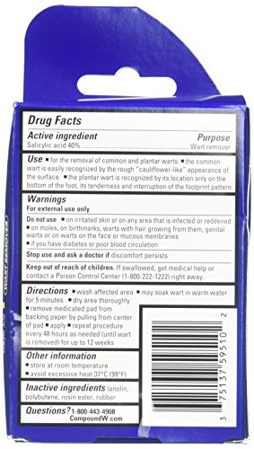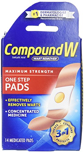 The leading brand in wart removal that’s proven safe and effective at removing common and plantar warts. Compound W one step pad conceals the wart while with maximum strength medicine in the pad treats the wart. These convenient one step pads are waterproof to seal and protect while treating. Compound W gets rid of warts fast and helps get your skin back to looking and feeling healthy.Feature