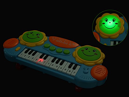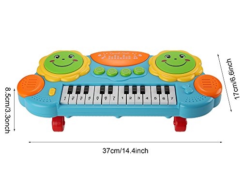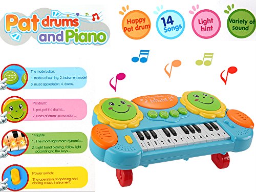 -. Feature : Brand: Arshiner / WARNING:CHOKING HAZARD -- Small parts. Not for children under 3 yrs. / Body Size: 37 x 17m/14.4 x 6.6 inch (Approx),Height: 8.5cm/3.3 inch / Main functions:5 Kinds of musical instruments,2 Learning modes,14 Keys with lighting,Interesting of the drum, Hand pat drum,16 Lights, dynamic music With power switch / Features:Happy clap drum,Let baby learn music when they playing,To enhance baby's interest of learning and improve the Auditory sense,Kids play along with lighting, quickly learn to play the song