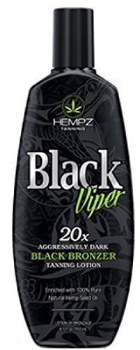 Unmerciful darkness awaits with Black Viper. This Aggressively Dark 20X Black Bronzer with DHA provides viciously dark color while a potent blend of Black Bamboo and Mushroom Extracts soothe skin leaving it feeling strikingly soft. Enriched with 100% Pure Natural Hemp Seed Oil that hydrates and conditions the skin for long lasting color, this dark bronzing potion will stop everyone in their tracks.Feature