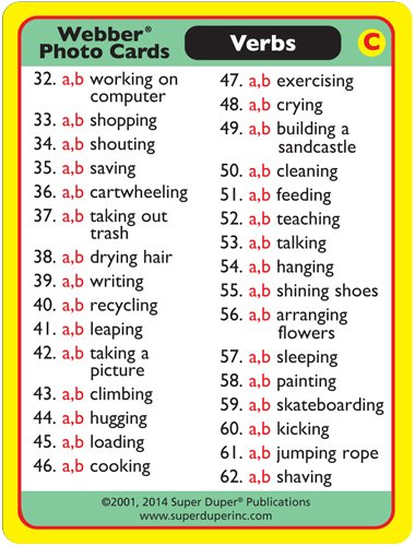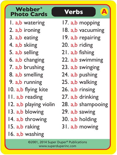 Webber Photo Cards - Verbs has a brand new look! Sharon updated the photos in our most popular set of 62 verb pairs with crisp, new, contemporary scenes (124 photos total). In this product revision, the comprehensive verb list is the same as in the original deck, but the photos are brighter and better than ever! Play Memory, Match-Up, Go Fish games, and more! Webber Photo Cards - Verbs
