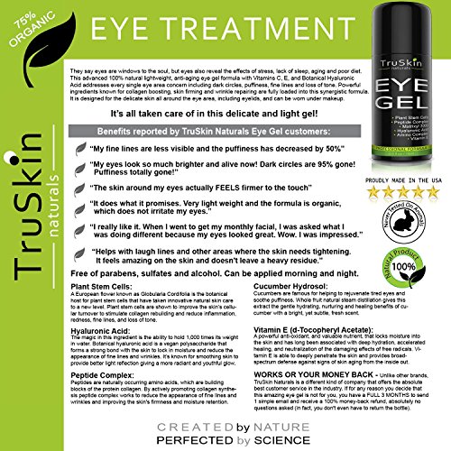 -. Feature : INSTANTLY AWAKEN - Tired Puffy Eyes with this natural, lightweight gel formulation that glides on cool and smoothly / UNIQUE FORMULATION - Addresses every single eye area concern possible including dark circles, eye bags, puffy eyes, wrinkles, undereye sagging, puffiness, loss of plump and firmness, crows feet, fine lines, loss of tone and resilience....its all taken care of in this delicate and light gel. / HIGHEST QUALITY NATURAL INGREDIENTS - Formulated with 75% organic ingredients and contains No Parabens, No GMO's, NO Alcohol, No Fillers, and is Fragrance-Free. / PROUDLY MADE IN USA - TruSkin Naturals Skin Care Products are responsibly formulated and bottled right here in the USA in a state-of-the-art FDA-Registered, GMO Certified Laboratory that is Cruelty Free (NEVER TESTED ON ANIMALS). / WORKS OR YOUR MONEY BACK - Unlike other brands, TruSkin Naturals is a different kind of company that offers the absolute best customer service in the industry. If for any reason you decide that this amazing eye gel is not for you, you have a FULL 3 MONTHS to send 1 simple email and receive a 100% money-back refund, absolutely no questions asked (in fact, you don't even have to return the bottle).