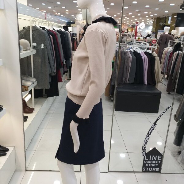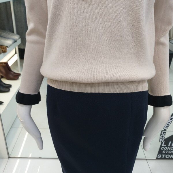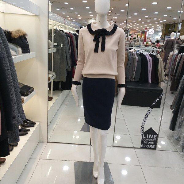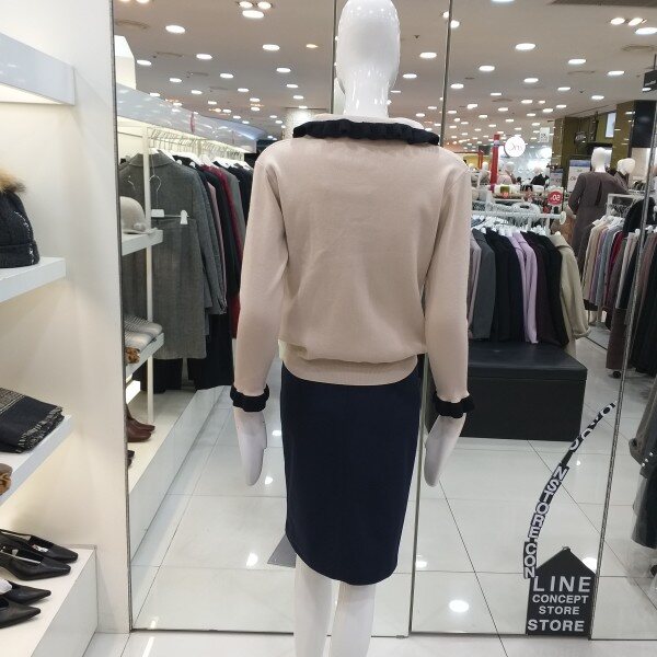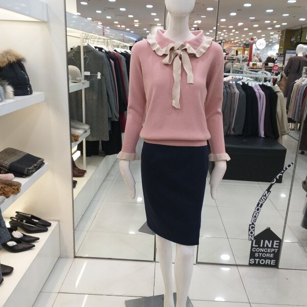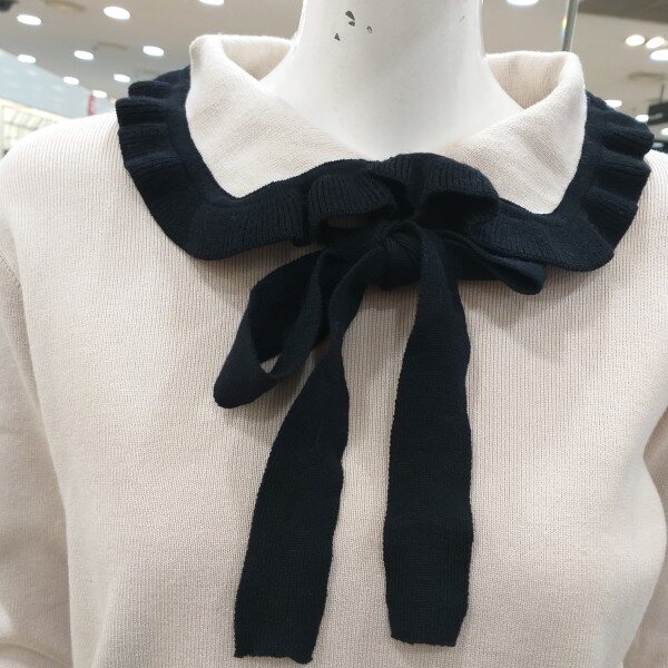 라인 2019봄신상 프릴 카라니트입니다.쁘띠타이로 리본연출이 가능한 카라와 소매배색이돋보이는 러블리 카라 니트입니다.부드러운 소재로 단품으로 착용가능하며여성스러우면서 귀여운 느낌의 니트로 슬렉스,스커트등에 다양하게 연출가능한 니트입니다.