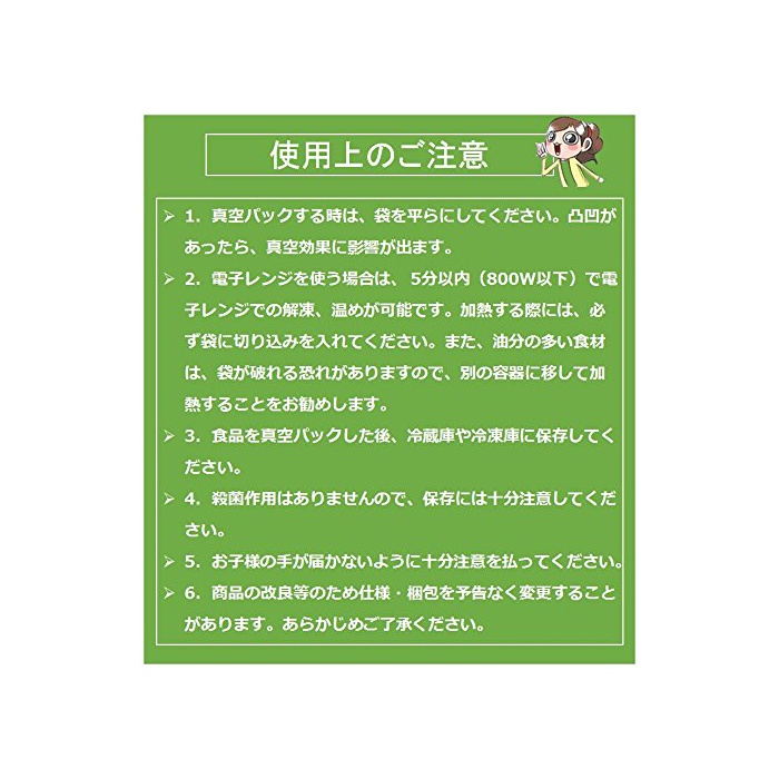【주의사항】1.진공 팩 하는 시,대를 평평함등으로 하십시오.울퉁불퉁이 있으면,진공 효과로 영향이 나옵니다;2.전자 레인지를 사용하는 경우에,5 분이내(800W이하)나와 전자 레인지 에서의 해동,따뜻하게가 가능합니다.가열할 때는,반드시 봉투에 잘라 포함을 넣고 하십시오.또한유분이 많은 식재료는,대가 깨질 우려가 있기 때문에,다른 용기에 옮겨 가열하는 것을 권장합니다;3.식품을 진공 팩 한 후,냉장고나 냉동고로 보존 해 주십시오; 4.살균 작용은 없기 때문에,보존에는 충분히 주의해 주십시오; 5.아드님이 손길이 미치지 않는 바와 같이(하도록) 충분히 주위를 기울이고 주십시오; 6. 상품의 개량 등를 위해 사양 포장을 예고 없이 변경하는 일이 있습니다.미리 양해 바랍니다.