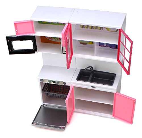 -. Feature : 'Modern Kitchen 16' Battery Operated Toy Kitchen Playset / Perfect for Use with 11-12" Tall Dolls! (~29cm) / All Doors Throughout the Playset Can Be Opened, Microwave Lights Up / Comes with Various Accessories such as Mini Toy Cups, Plates and Much More! / Requires 3 LR44AG13 Batteries to Run (Included) Width: 10" Height 12.5"