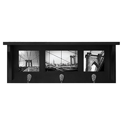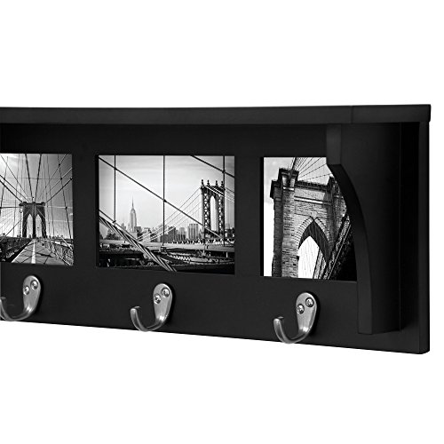 This coat rack shelf features 3 metal hooks, picture collage frame (3 openings) and 1 integrated display shelf. It's perfect for your entryway organization. Hang your keys, leashes, accessories, hats, scarves, coats, etc. And display your favorite decorative items on the shelf. There are 3 openings to display your favorite photos (2-4x4and 1-4x6). this easy to hang shelf comes assembled with hanging hardware.