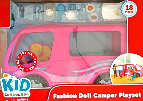 This 18 piece doll camper play set fits any 12" Barbie doll and provides hours of fun it comes with 2 detachable chairs, table, grill and 13 accessories (food/pots/pans/dishes/utensils/marshmallow sticks). Appropriate for ages 3+ and batteries are included.Feature