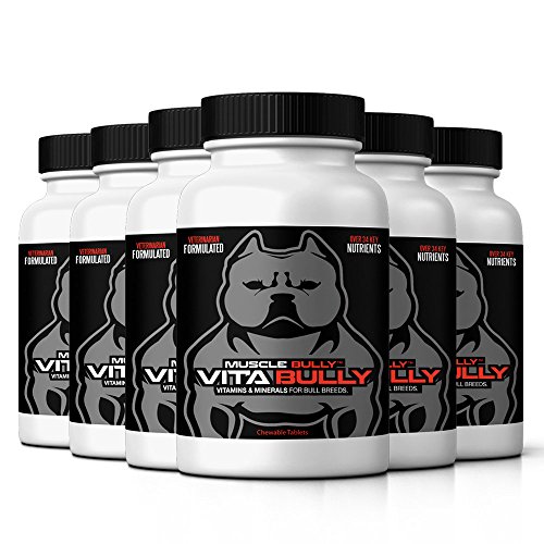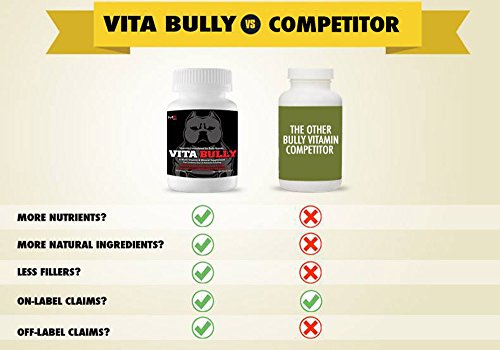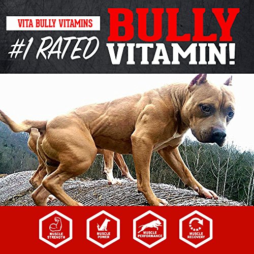 VITA BULLY IS A GREAT TASTING VITAMIN FOR YOUR DOG THAT HELPS SUPPORT: Muscle building, Increased Energy/Strength, Shiny Coat, Nail Color, Strengthens Immune System and overall Improvement of Health. DOG'S LOVE THE TASTE & EAT IT LIKE A TREAT! Check out our awesome reviews from dozens of satisfied dog owners who've purchased and used Vita Bully with their dog. YOUR DOG'S FOOD IS LACKING VITAMINS AND NUTRIENTS. According to a report done by the Animal Nutrition Group, Vitamin A, E, B-group vitamins and other of nutrients are destroyed (as much as 65% loss) during the extrusion process of dog food. Vita Bully Vitamins contains over 34 nutrients and vitamins in each tablet. 100% MONEY BACK GUARANTEE, TRY IT OUT: We guarantee your dog will love and enjoy taking Vita Bully. If your dog doesn't enjoy them then send us back the product for a full refund of the product! No questions asked. We want you 100% satisfied and of course want your dog to enjoy them. Will your dog enjoy them? There's only one way in knowing... Giving us a shot! After reading our guarantee, there's nothing to lose. Recommended for American Bullies, Pit Bulls, Exotic Bullies, Bulldog Breeds, Bull Terriers, Staffordshire Bulls, American Bulldogs, French Bulldogs and Pocket Bullies. However all dog breeds can use it. Vita Bully is 100% Safe, Veterinarian Formulated and Approved with NO Side Effects and contains Superior HIGH Quality ingredients. MADE IN THE USA. Please feel free to view and read our ingredient label above. Vita Bully contains 17 more nutrients over the other Bully vitamin competitor. Vita Bully was specifically formulated in a 1½ gram tablet to eliminate useless fillers where the competitor comes in a 3 gram tablet that contains almost 50% more useless fillers. We challenge you to compare our ingredients and nutrients on our labels to the other bully supplement vitamins on the market and see why we are better and how we beat them in every health and nutrition categories.Feature