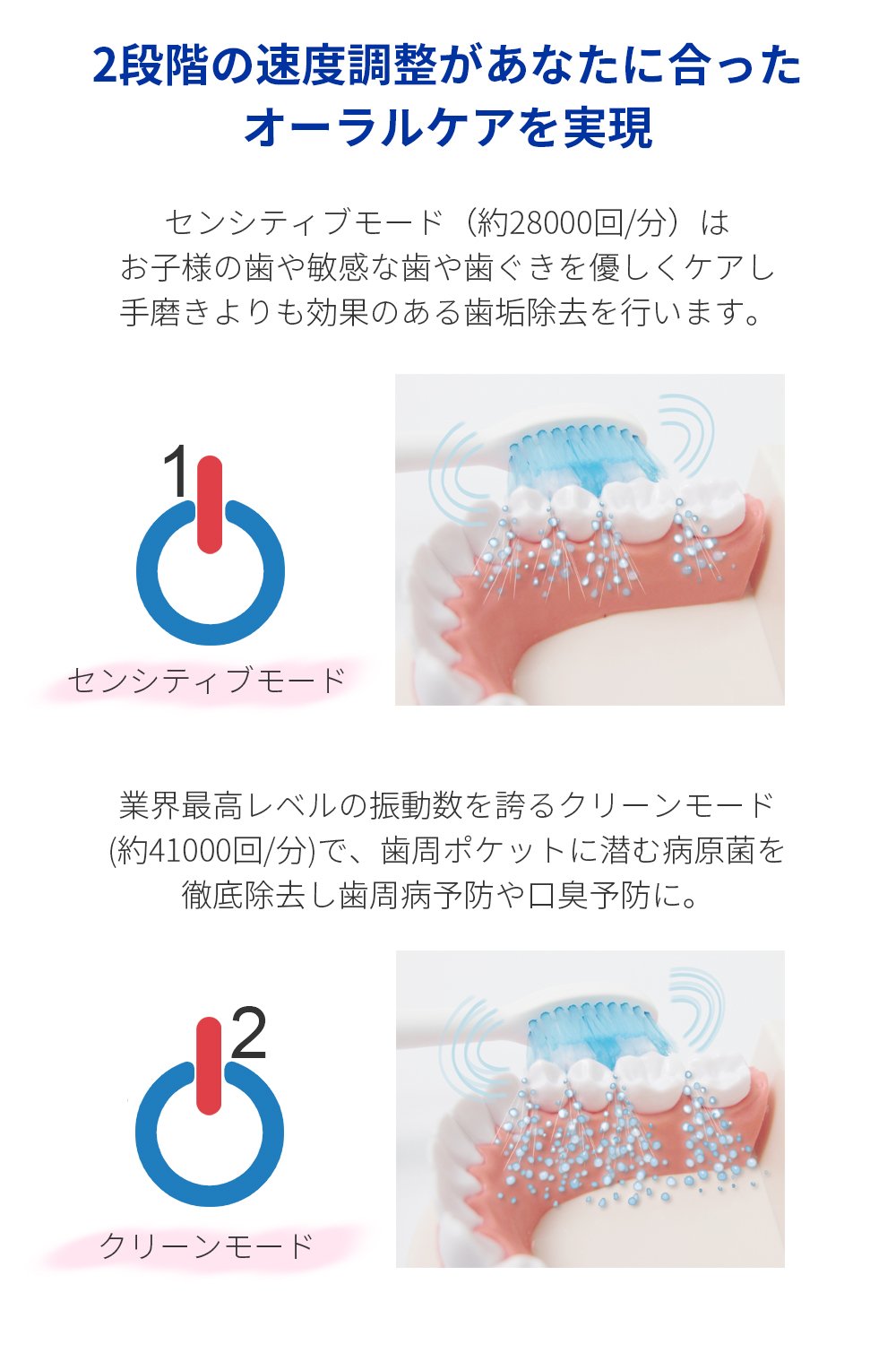 Sensitive mode (about 28000 times / min) care gently for children's teeth, sensitive teeth and gums, and performs dental plaque removal that is more effective than hand polishing.