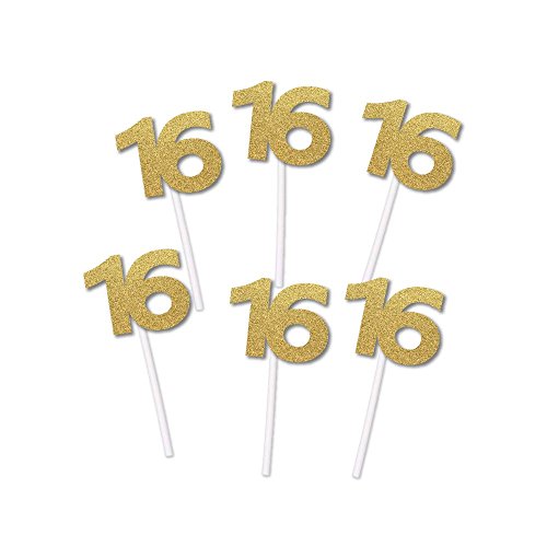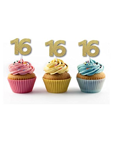 16th Birthday Cupcake toppers in Gold Glitter (20 count) - Sweet Sixteen Anniversary, Retirement, Party Decorations