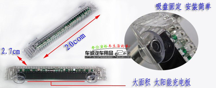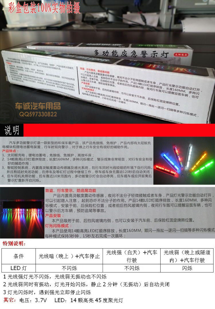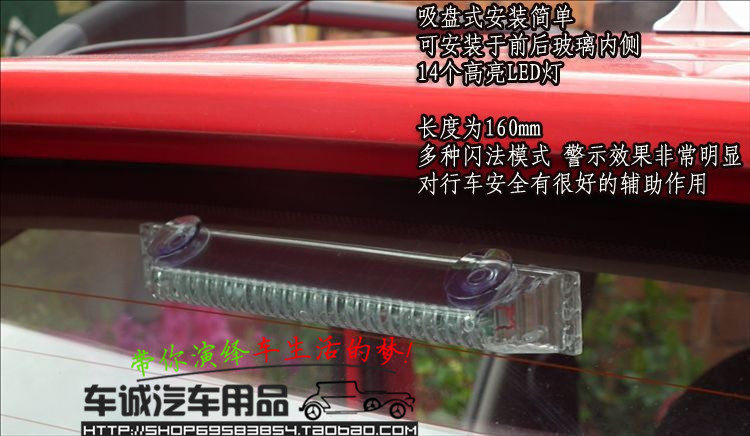 Traffic warning, anti-theft, anti collision function, product built-in high sensitive vibration sensor, night criminals minor touch body, product light warning function automatically open, can cause the attention of passers-by,to intimidate criminals role. The product of 14 LED lights order, length 160MM, many flashing mode, mounted in the front, rear windshield glassinside, driving at night to warn the oncoming vehicles, can be as a warning to the rear of the vehicle, the prevention of accident.