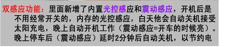 4, intelligent control system, built-in high sensitive vibration sensor and photosensitive system, driving at the same time in low light conditions toflicker. And there is a time delay closing function, continue to work in the carand wait for the red light process, parking or body without automatic closingmotion after 120 seconds;