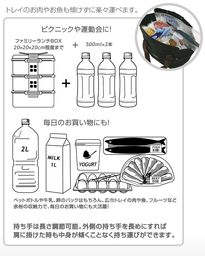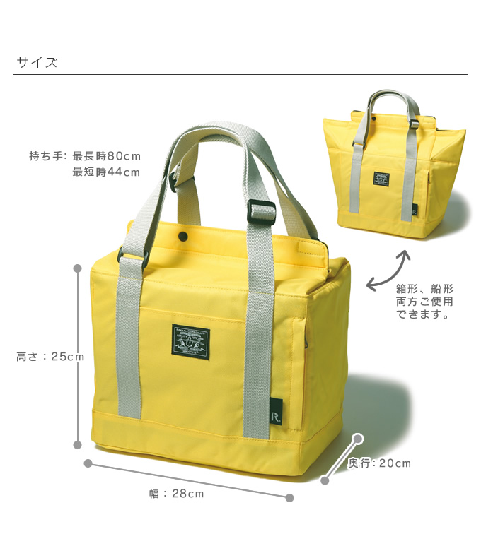 | ポイント | トートバックのブランド、ルートートのバッグ。 簡易保冷機能付きルートート「サーモキーパー」。 箱型、船形の両方で使えるボックスタイプ。 また、持ち手は長さ調整ができ、持ち運びに便利です。 |