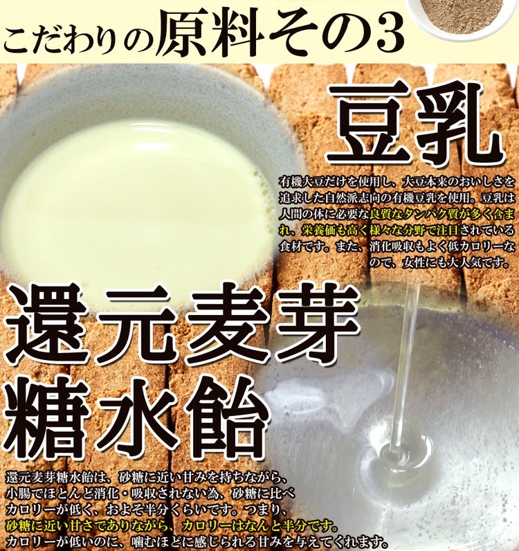 | 原材料名 | 還元麦芽糖水飴、おから、有機栽培豆乳、食用菜種油、小麦ふすま、うるち米(玄米粉) |