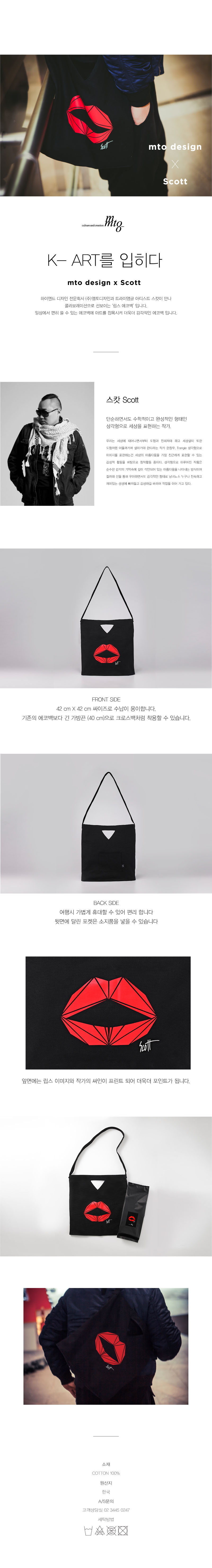 | 삼각형으로 세상을 표현하는 트라이앵글 아티스트 스캇의 '스캇 립스 에코백' by MTO Design 우리는 세상에 태어나면서부터 도형과 친해져야 하고 세상살이 또한 도형처럼 어울려가며 살아가야 한다라는 작가 한창우. Trangle 삼각형으로 이미지를 표현하는건 세상의 아름다움을 가장 친근하게 표현할 수 있는 감성적 활동을 바탕으로 창작활동 중이다. 삼각형으로 이루어진 작품은 순수한 감각의 기억속에 깊이 각인되어 있는 아름다움을 나타내는 방식이며 컬러와 선을 통해 우아하면서도 감각적인 형태로 남녀노소 누구나 친숙하고 재미있는 상상에 빠져들고 감상하길 바라며 작업을 이어 가고 있다. 이번 콜라보레이션을 통해 스캇작가의 강렬한 아트워크를 에코백에 접목시켜 트랜디한 디자인을 연출하였다. |