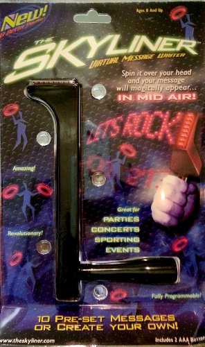 Studio : The Skyliner Publisher : The Skyliner Binding : Toy Product Description Easy to operate: choose from 10 preset messages or easily store 3 of your own messages of up to 18 characters each! Twirl the Skyliner and your message magically appears in mid-air overhead! Uses 2 replaceable AAA batteries (included). Preset Phrases include: COOL, LOVE YOU, HELP, LET'S PARTY, HAPPY BIRTHDAY, HAPPY NEW YEAR, BRAVO, OH YEAH!, GO FOR IT, TAXI. Store your own messages too by simply tapping buttons on the Skyliner to program your own displays. 0