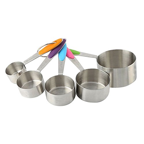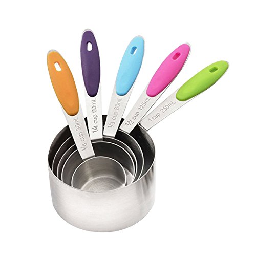 Durable and accurate measuring cups set includes 5 different sizes: 1/8 cup 30ml, 1/4 cup 60ml, 1/3 cup 80ml, 1/2 cup 125ml. Engraved measurement markings on the soft rubber handle.