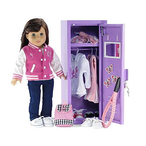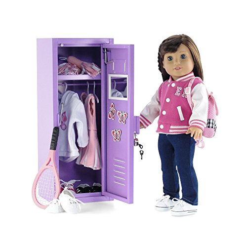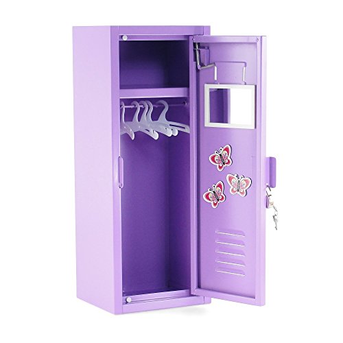 Whether storing clothing or accessories, this 18 inch doll sized school locker is pretty, affordable and functional! This amazing doll accessory is a lovely shade of lavender and has a functioning heart shaped lock with key, making it a realistic miniature version of a real school locker! Inside there is an rod that holds plenty of doll clothing and we have even included 5 perfectly sized plastic hangers to get stay organized. The top shelf is roomy and can store plenty of shoes and small accessories, but that's not all, this amazing locker also comes with a white magnetized mirror, 3 beautiful and colorful butterfly magnets and even a thick white card so you can add a personal touch! Functional, pretty and with LOTS of accessories this doll school locker is a one of a kind, amazing value for your 18 inch doll! *Doll Not Included*Feature