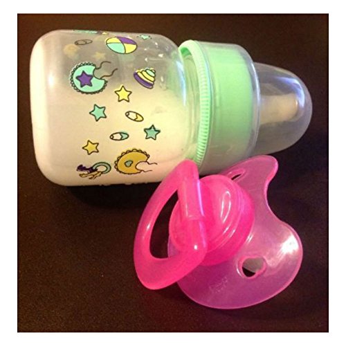 -. Feature : MOST LIKELY YOU WILL GET A PINK PACIFIER NOT PURPLE ONE GREEN BOTTLE FILLED W FAUX NON TOXIC FORMULA IT IS GLUED SHUT CAN NOT BE OPENED IT IS PRETEND DOLL MAKES SUCKING NOISES HAS SILICONE AND MAGNET AT THE TIP THAT IS FULLY DRIED ( BOTTLE AND PACIFIER) THEY BOTH MAKE THE DOLL SOUND LIKE SHE IS DRINKING HER BOTTLE OR USING HER PACIFIER / THE PACIFIERS, WILL BE PLAIN PINK OR PLAIN PURPLE YOU WILL GET ONE BOTTLE AND ONE PACIFIER YOU CANT CHOOSE PACIFIER AS IT IS WHAT EVER I HAVE IN STOCK / AGAIN YOU WILL GET ONE PINK PACIFIER OR ONE PURPLE PACIFIER WHICH IS PLAIN COLORED I USUALLY HAVE THE PINK PACIFIERS AVAILABLE
