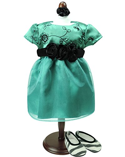 -. Title : 15 Inch Baby Doll Special Occasion 3 pc Set, Green Embroidered Dress, Hairpiece and Zebra P.R.Int Shoes