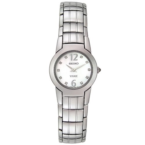 Polished stainless steel case with a polished stainless steel bracelet. Fixed bezel. White mother of pearl dial with silver-tone hands and set with 10 diamond hour markers. Arabic numerals at the 6 and 12 o'clock positions. Japanese quartz movement. Hardlex crystal. Case diameter: 15mm. Case thickness: 8mm. Push button hidden clasp. Water resistant at 50 meters (165 feet). Seiko Diamond Ladies Watch SUJ281.Feature