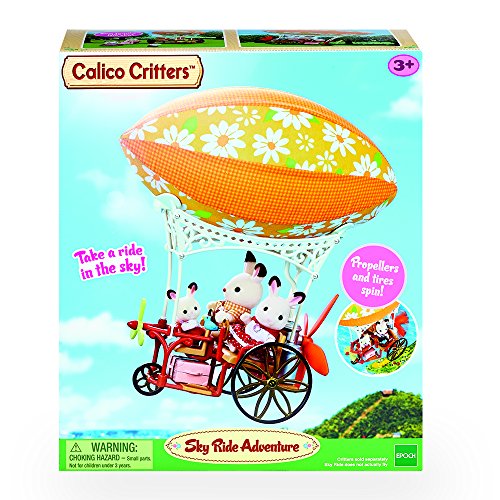 Calico Critters can pack their picnic basket and take an imaginary trip in the sky! Propellers spin and wheels turn. Skyride Adventure seats 3 Critters. Calico Critters is a unique and adorable range of distinctive animal characters with charming and beautifully detailed homes, furniture and accessories. They live, work and play in an idyllic and wonderful place called Calico Village. These timeless, classic toys promote wholesome family values. These life-like, award-winning miniatures also inspire imagination and creativity. These adorable toys promote healthy cognitive development through pretend play. Acting out storylines will exercise narrative and critical thinking processes, while fine motor skills and dexterity improve as little ones manipulate the fun environments, critters and accessories. Critters sold separately.Feature