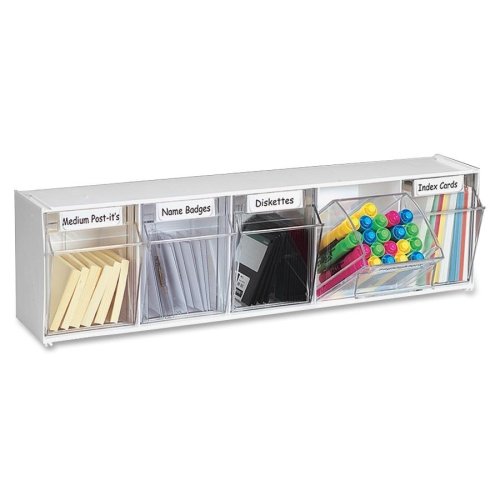 Studio : Deflect-O Publisher : Deflect-O Binding : Electronics Product Description Modular unit with white frame and clear bins features a unique interlocking design that lets you mix, match and stack different sizes. Mount bin storage system to a wall or place on a countertop. Bins tilt out, stay open, and then close again with the touch of a finger. Each bin can be easily removed from locking mechanism for easy cleaning or refilling. Tilt Bin Storage System includes mounting hardware and identification labels. 0