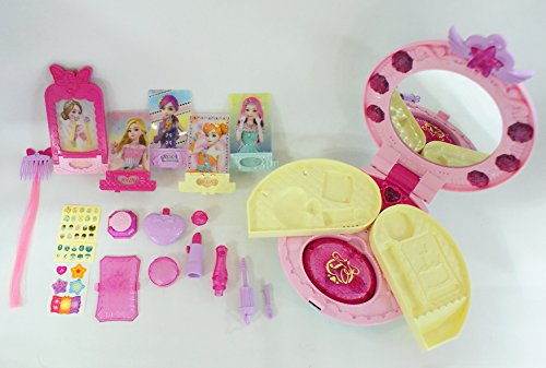 Includes a vanity, 5 Character Cards, 1 Lipstick, 1 Mascara, 1 Perfume, 1 Hair piece, 1 Eye shadow, 1 Comb, 2 Sticker set