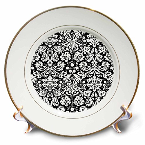 3dRose cp_151442_1 Black Damask with White Stylish Swirly French Floral Pattern Vintage Sophisticated Flowery Wallpaper-Porcelain Plate, 8-Inch