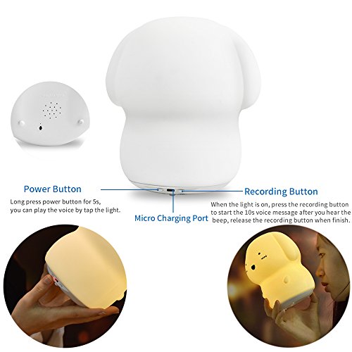 - [Voice Recording] The adorable doggy with voice recording is design for you to leave a voice message to your beloved. If you want to create a surprise for them, turn it on and press and hold the recording button on the right to start the 10s voice message after you hear the beep, and release the recording button after finish. Press the power button for 5s into voice mode and then tap the lamp to play your record.