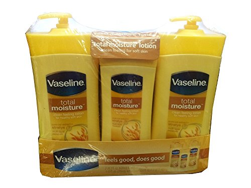 - Feature : Vaseline Total Moisture Lotion 3 Pack / Clean feeling lotion for softer skin / Feels good, does good / Pure Oat Extract plus Stratys 3 multi layer moisture