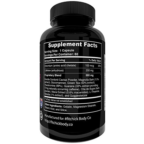 WHAT'S IN THERMOGENIC FAT BURNER FOR WOMEN by #fitchick BODY CO? Ingredients include Hoodia Gordonii Cactus Powder, Magnolia Bark, Green Tea, and Theobromine, Guarana, Cha d Bugre, Maca, L-Theanine, Banaba, Gugglesterone, Chromium, and Caffeine (about 2 full cups of strong coffee).