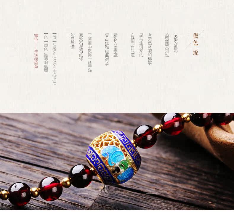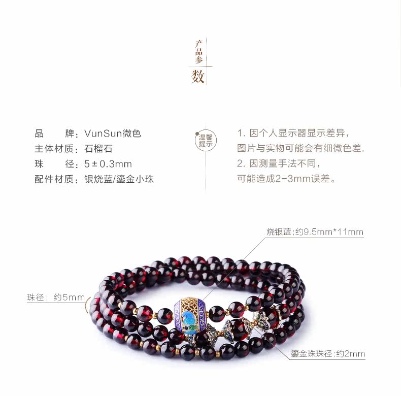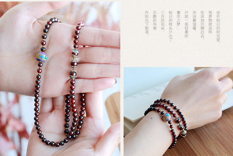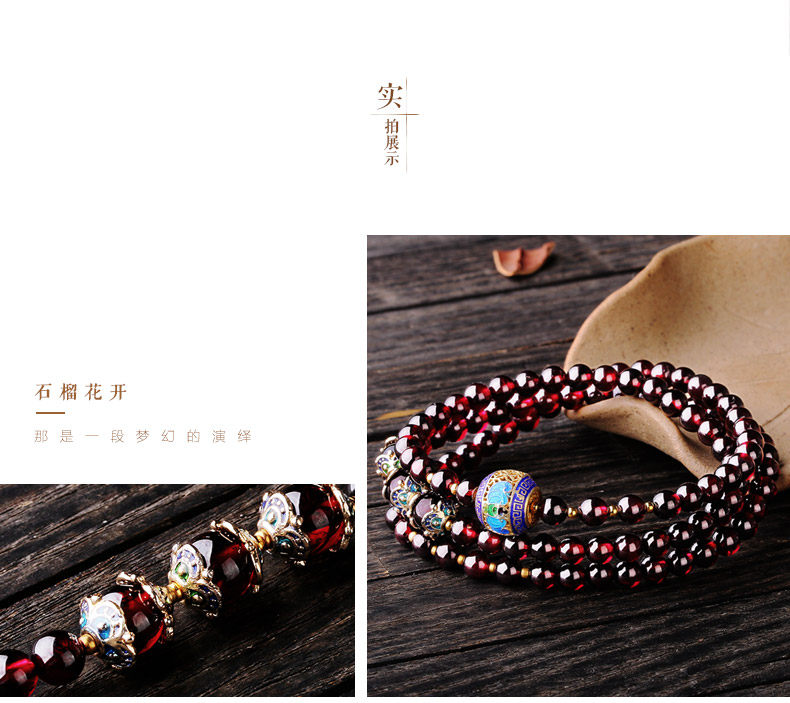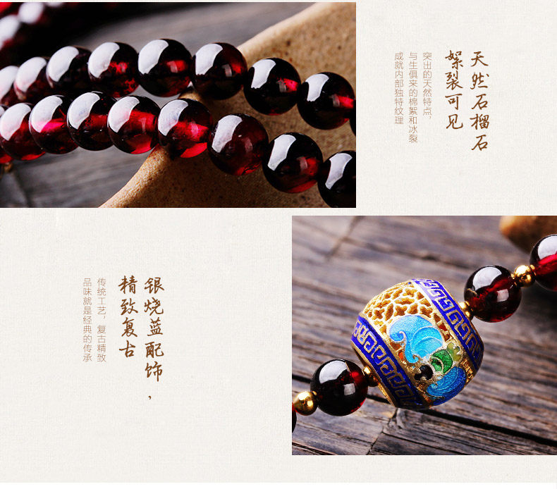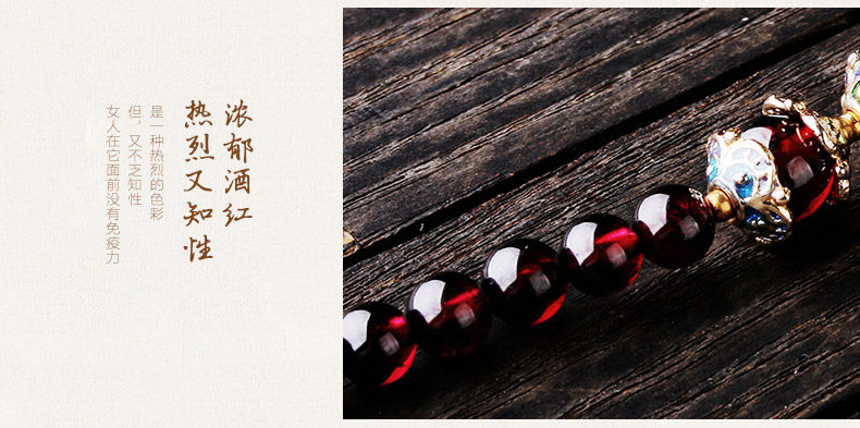 天然酒红石榴石手链女 多层多圈景泰蓝民族风 文艺饰品礼物