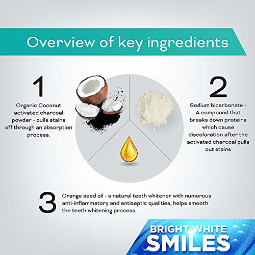A NATURAL FORMULA: The Bright White Smiles charcoal powder is 100% natural and safe. Its ingredients are organic coconut charcoal, orange seed oil, sodium bicarbonate and mint flavor. These are the ONLY ingredients. There are no harmful additives and hazardous chemicals, so the teeth whitening charcoal powder is safe even for those people who have sensitive teeth, enamel and gums.