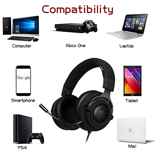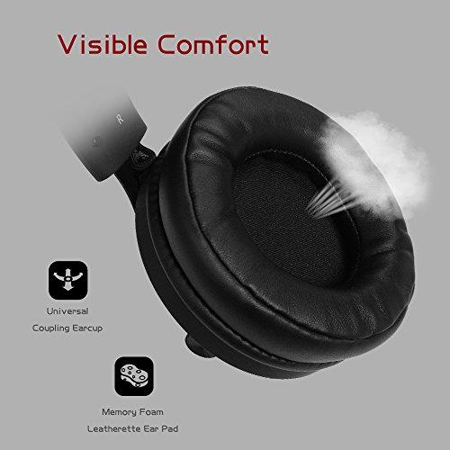 Comfortable Fit: Soft leather ear cups cover your ears entirely and gently. Also, the adjustable ergonomically padded headband, featuring innovative fabric materials, allows for multi-level adjustion, ensures perfect fit for any head sizes, even ideal for those wearing glasses. No more fatigue after long gaming sessions